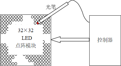 (高年级组) 一、设计任务 设计并制作一个基于32×32点阵LED模块的书写显示屏,其系统结构如图1所示。在控制器的管理下,LED点阵模块显示屏工作在人眼不易觉察的扫描微亮和人眼可见的显示点亮模式下;当光笔触及LED点阵模块表面时,先由光笔检测触及位置处LED点的扫描微亮以获取其行列坐标,再依据功能需求决定该坐标处的LED是否点亮至人眼可见的显示状态(如图1中光笔接触处的深色LED点已被点亮),从而在屏上实现“点亮、划亮、反显、整屏擦除、笔画擦除、连写多字、对象拖移”等书写显示功能。