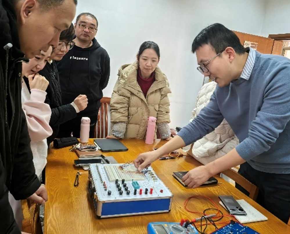在明确合作方向后,研讨进入实操环节。三方共同对一台旧实验箱进行现场拆卸,直面设备老化、模块冗余、故障频发等具体问题。与会教师结合长期一线教学经验,指出了学生实验过程中常见的痛点,如芯片易烧毁、电位器易损等。大家边拆边议,气氛热烈,围绕模块布局优化、电路保护加强、功能整合提升等方面提出多项具体建议。例如,可删除使用率低的连续脉冲发生器与交流供电模块,增设两路可调直流电源及典型共射放大电路模块,并对易损单元增加保护电路,从而提升设备的操作便捷性、稳定性和教学效率。这种“开箱见症、对症开方”的互动模式,精准定位了改造需求,也在交流中碰撞出多项兼具教学实用性的优化方案。