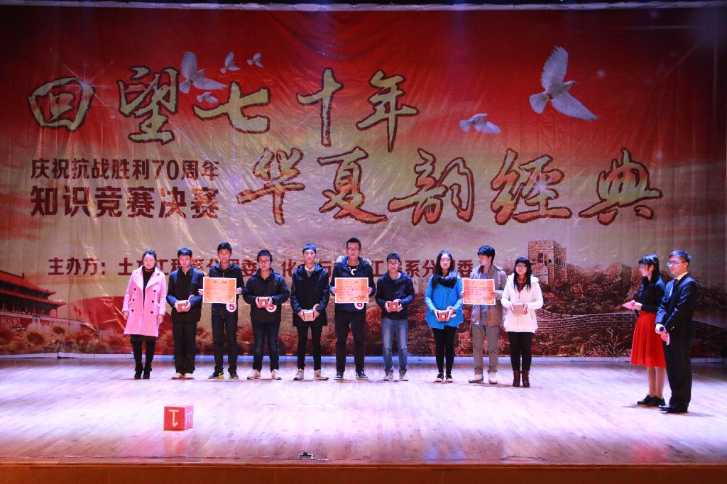 为了纪念抗日战争胜利及世界反法西斯战争胜利,12月13日晚6点,由化工与制药工程系和土木工程系联办的“回望七十周年,华夏韵经典”庆祝抗战胜利70周年知识竞赛决赛在大学生活动中心313举行。出席本次大赛的嘉宾有化工与制药工程系分团委书记刘静老师,土木工程系分团委书记孙琳玲老师及各系学生干部。