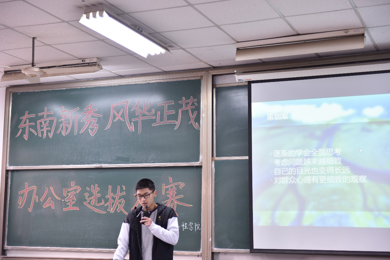 3月18日17时,由制药与化学工程学院分团委学生会主办的“东南新秀 风华正茂”办公室选拔大赛决赛于成贤501顺利落幕。分团委学生会各部门部长出席本次大赛。