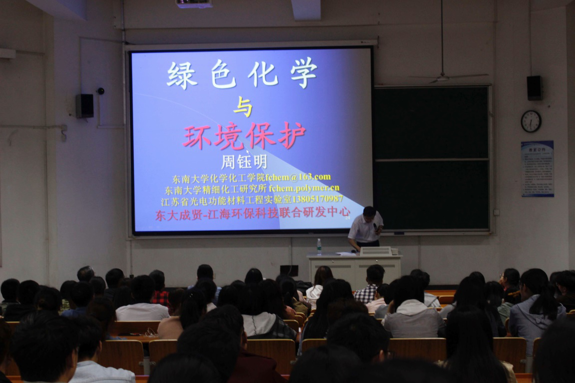 2018年4月23日下午18:10,东南大学化学化工学院教授 ,博士生导师周钰明教授在文昌110为制药与化学工程学院师生带来了题为《绿色化学与环境保护》的学术讲座。我院院长林保平老师,党总支副书记周继荣老师,综合办主任李平老师,化工系主任陆瞿亮老师参加本次讲座。