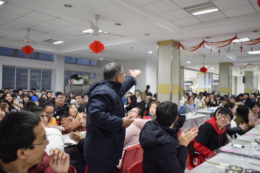 学生处处长唐小平老师的精彩发言为本次饺子宴拉开序幕。家宴伊始,综合办主任李平老师亲自上阵,为同学们示范包饺子的正确方法,李老师幽默风趣的语言调动了全场的氛围。全体同学共同参与包饺子环节,每人大展身手做出各种“创意”饺子,全场笑声连连,最后由辅导员评选出“谁是佼佼者”最佳形象饺子,并由食堂加工。此次家宴亦对获得“优秀学生”的同学进行了表彰,并邀请了在个人及班团建设方面的几位优秀学生代表发言。随着万众期待的饺子上桌,本次家宴达到高潮,同学们在一片欢声笑语中吃着热气腾腾的饺子。“大胃王”和“就一个字”这两个趣味十足小游戏的进行,更是激发了同学们的兴致。在欢乐与温暖的氛围中,此次家宴接近尾声。