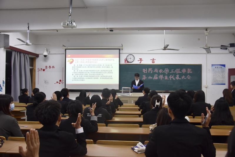 会议在雄伟的国歌声中隆重开幕。大会伊始,各学生代表听取、审议了《东南大学成贤学院制药与化学工程学院学生会第十四届主席团选举办法》和《东南大学成贤学院学生会第二次学生代表大会常任代表选举办法》,并全票通过。