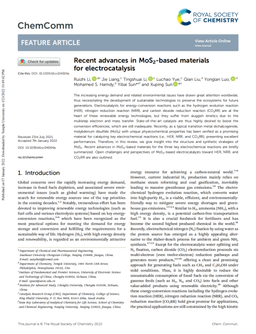 该成果以李锐智同学为第一作者,东南大学成贤学院第一单位,以“Recent Advances in MoS2-based Materials for Electrocatalysis”为题,发表在了国际期刊Chemical Communication 上,制药与化学工程学院孙贻白老师、电子科技大学孙旭平教授为共同通讯作者。