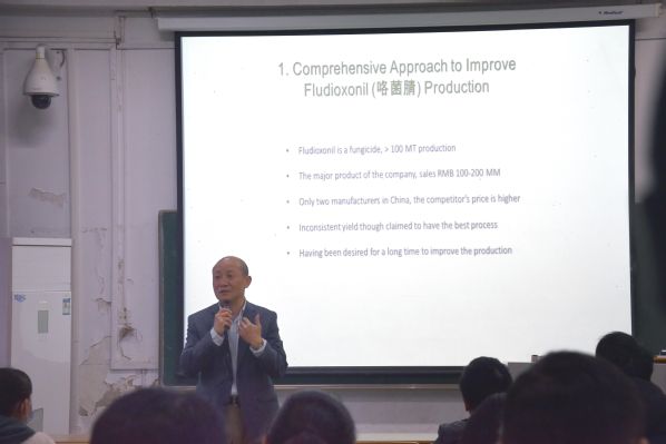 讲座中,朱远明博士首先就其在陶氏化学任职经历让同学们了解了如何丰富化学工艺路线设计、开发、优化和评估,之后着重向同学们介绍了化学工艺及各项新技术的研发与应用、科研项目的管理,其中包括新兴工艺开发、现有工艺改进、新制剂开发、现有制剂剂型改进、中试及技术转让、三废处理等。最后朱远明博士表达了自己对化工学科未来发展的美好祝愿,也期待同学们在不久的将来可以为化工事业奉献自己的一份力量。