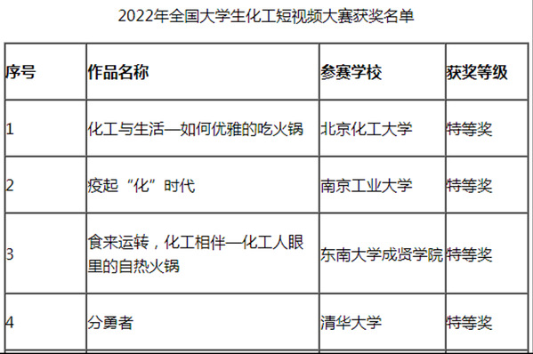 近日,由中国化工学会主办、南京工业大学承办的2022年“科思化学杯”全国大学生化工短视频大赛落下帷幕,东南大学成贤学院制药与化学工程学院二十余人组队参加本次比赛。其中,原创视频《食来运转,化工相伴—化工人眼里的自热火锅》荣获特等奖,《你发现奶茶吸管变了吗》荣获三等奖。本次大赛历时7个月,来自清华大学、浙江大学、天津大学等71所高校的154部作品参赛,其中19所高校的20部作品进入总决赛。经过激烈角逐,大赛产生特等奖4组、一等奖6组、二等奖10组。总决赛分答辩和视频展示两个环节,各参赛队伍从化工与生活、环境、国家战略等角度出发设计作品,创意巧妙、讲解透彻,充分展现化工学子扎实的理论功底和勇于创新的精神风貌。
