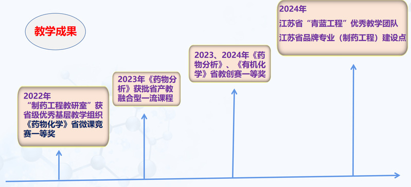 “十四五”期间,学院全面启动教学改革工作,以课程建设与改革为载体,以教师教育教学能力测评为手段,有计划、有步骤地推进课程建设与改革工作。通过建立“理论教学-实践训练-综合创新能力培养”三维并重的课程体系,形成了基于“课程链-人才链-产业链”三链对接的育人培养体系。近五年来,教师结合本专业学生特点和授课实际,已建设多门在线开放课程,承担各类教研教改项目40余项,发表教改论文数十篇。编写出版国家级规划教材、“十二五”江苏省高等学校重点教材、专著近10本,自编讲义多本。《药物分析》课程获批江苏省产教融合型一流本科课程立项建设,获第三届江苏省高校教师教学创新大赛一等奖、第五届全国高校混合式教学设计创新大赛三等奖;《有机化学》课程入选校级金课建设、获第四届江苏省高校教师教学创新大赛一等奖;《药物化学》课程通过校级课程思政示范课验收,获江苏省微课竞赛一等奖、校级“课程思政”优秀教学案例一等奖;《药事管理学》课程获批校级课程思政示范课立项、校级“课程思政”优秀教学案例一等奖。